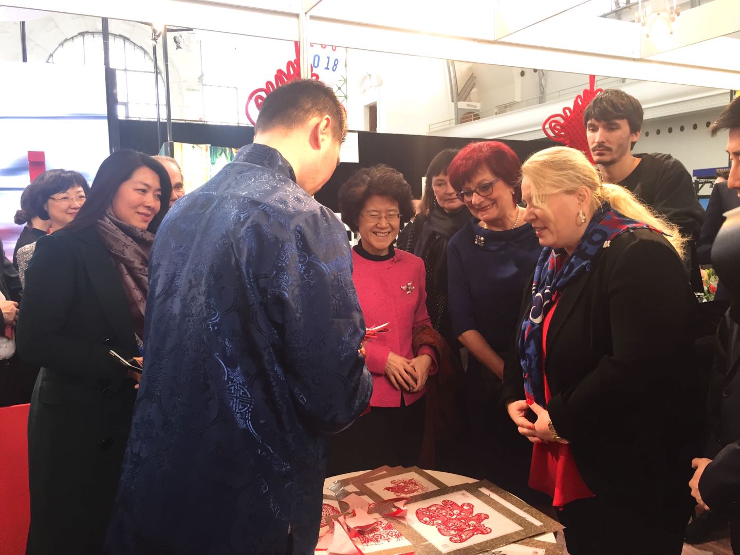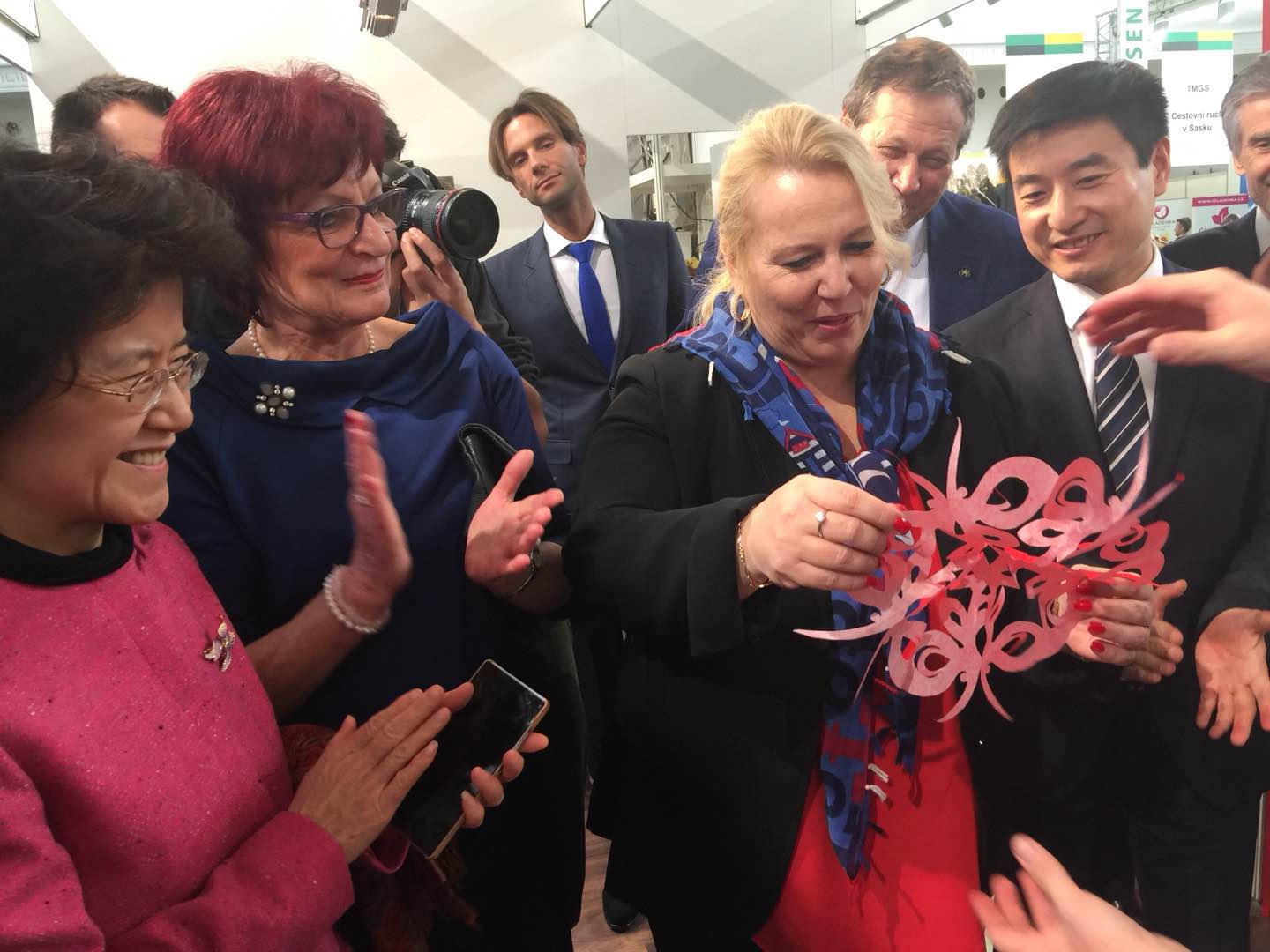 捷克地方發(fā)展部部長多斯塔洛娃饒有興趣地觀賞剪紙表演,與表演者熱情交流
