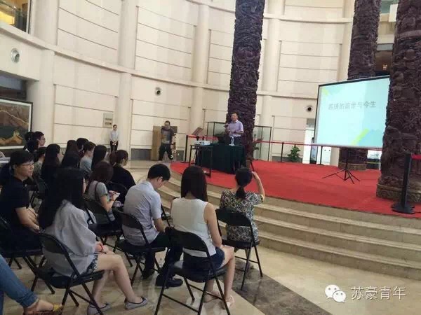 參觀完館藏珍品后,愛濤文化產(chǎn)業(yè)公司總經(jīng)理助理、研究員級高級工藝美術(shù)師呂元先生為大家做了一場題為《蘇繡的前世與今生》的藝術(shù)講座。講座在宏偉的木雕巨作“四大名柱”下開講,呂元先生旁征博引,從中華民族的起源講起,系統(tǒng)而細致地將蘇繡這一民族傳統(tǒng)工藝的前世今生講得精彩透徹,獲得了青年同事們的一致好評。