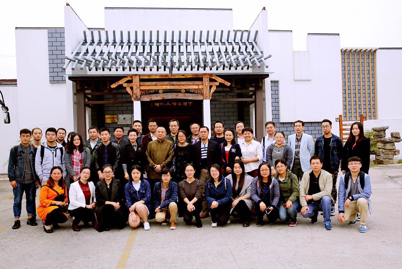 鼎盛絲綢董事長吳建華與蘇豪傳媒副總經(jīng)理單鳳艷率參展團(tuán)在中國宋錦文化園前合影